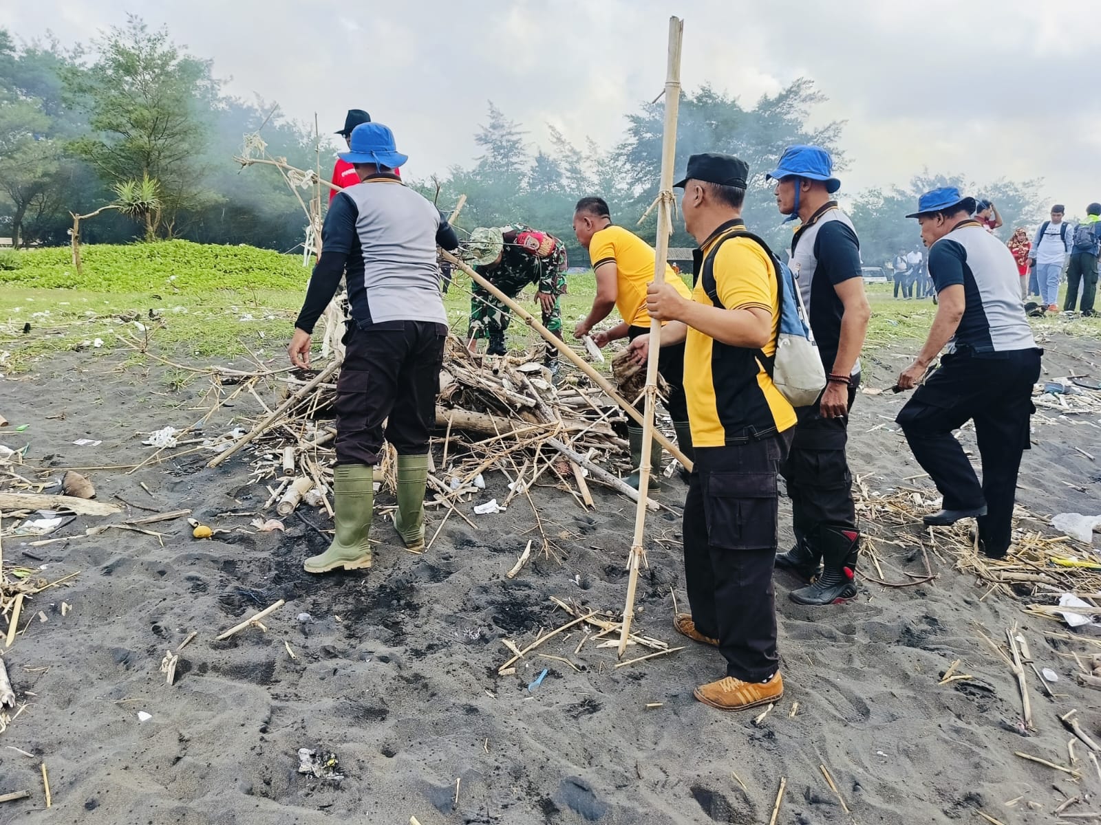 Sejumlah personel Polsek Puger yang merupakan jajaran Polres Jember Polda Jatim bersama anggota TNI dan masyarakat gotong royong menyisiri pantai, mengumpulkan sampah kayu, bambu, serta limbah yang terbawa arus laut dan berserakan di sepanjang pantai.